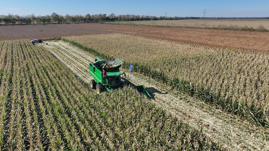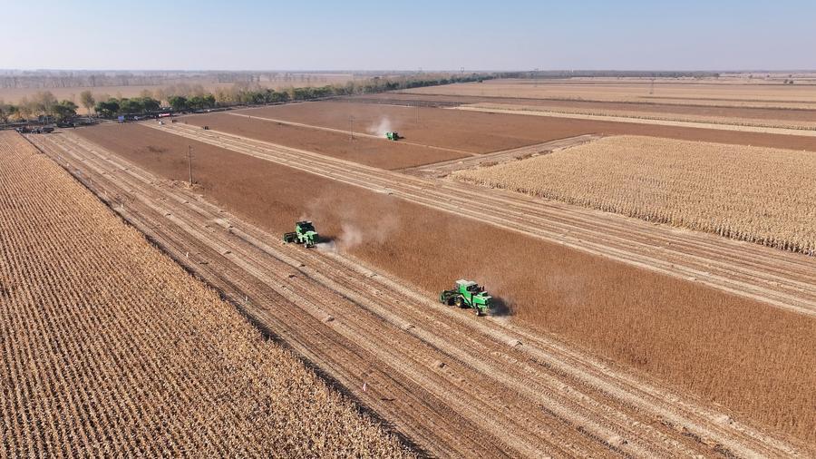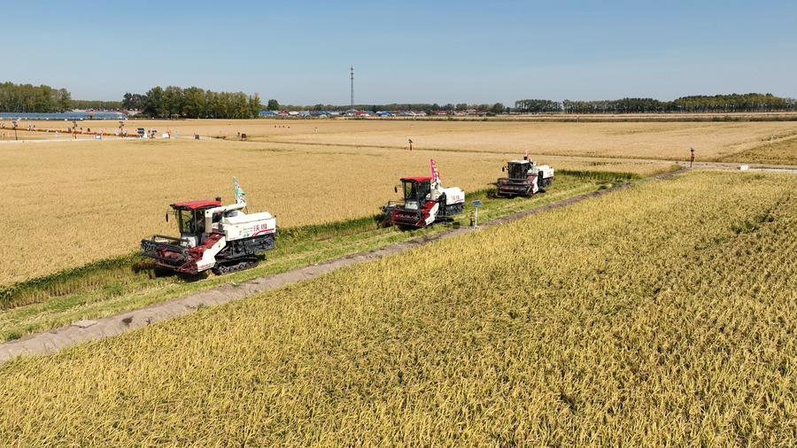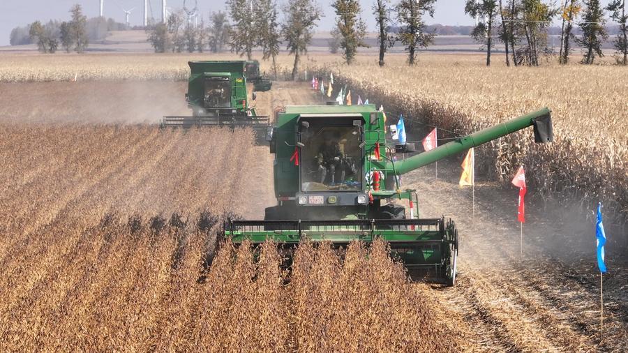 黒竜江省ジャムス市樺川県の農地での食糧収穫風景。(9月25日撮影、ジャムス=新華社配信)