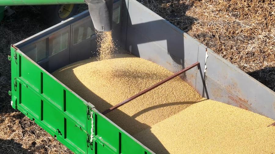 黒竜江省ジャムス市樺川県の農地で収穫された食糧。(9月25日撮影、ジャムス=新華社配信)