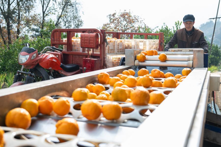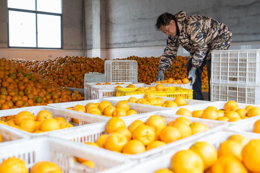 11日、湖北省宜昌市長陽トゥチャ族自治県で、収穫した清江ポンカンを仕分ける村民。(宜昌=新華社記者/杜子璇)