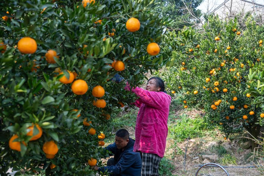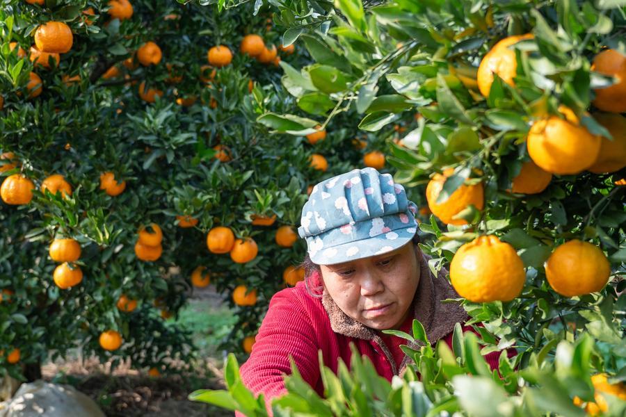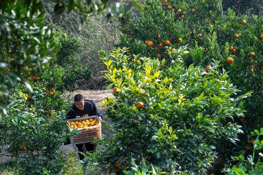 11日、湖北省宜昌市長陽トゥチャ族自治県で、清江ポンカンを収穫する村民。(宜昌=新華社記者/杜子璇)
