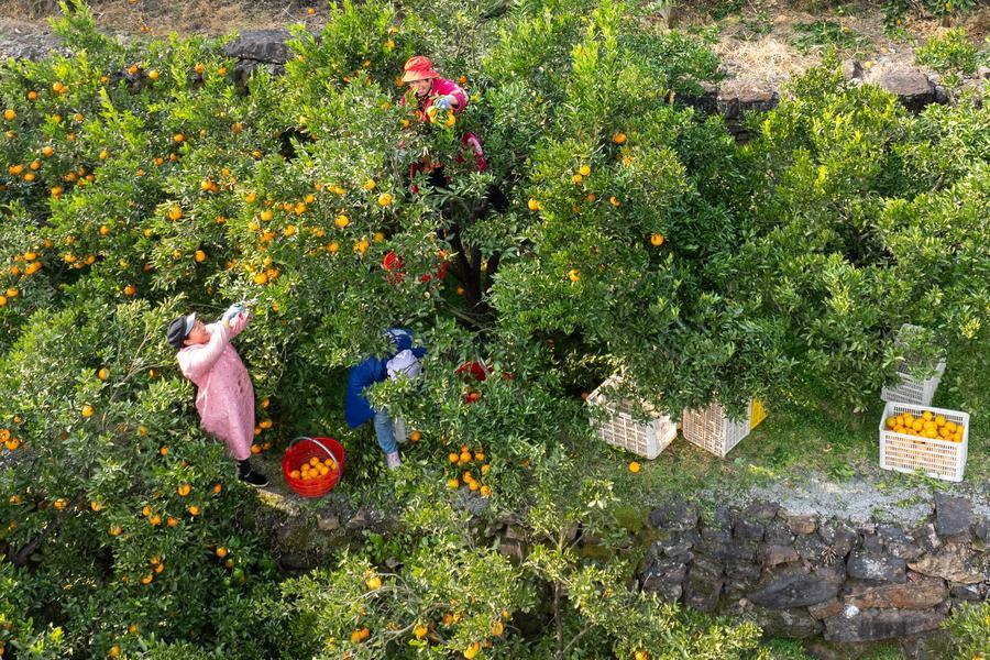 11日、湖北省宜昌市長陽トゥチャ族自治県で、清江ポンカンを収穫する村民。(ドローンから、宜昌=新華社記者/杜子璇)