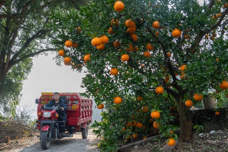 11日、湖北省宜昌市長陽トゥチャ族自治県で、清江ポンカンを運ぶ村民。(宜昌=新華社記者/杜子璇)