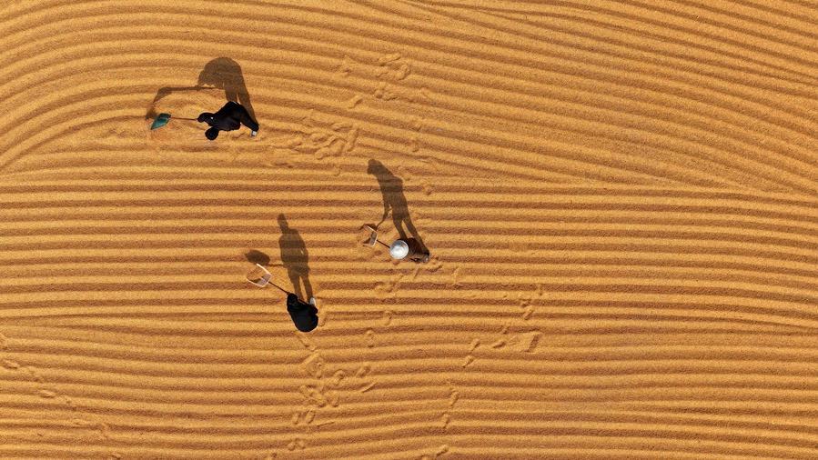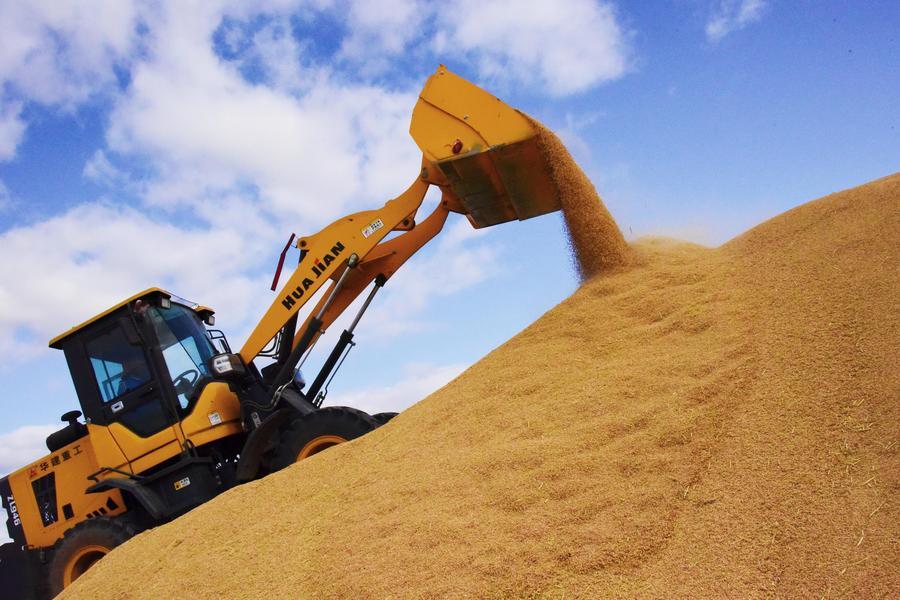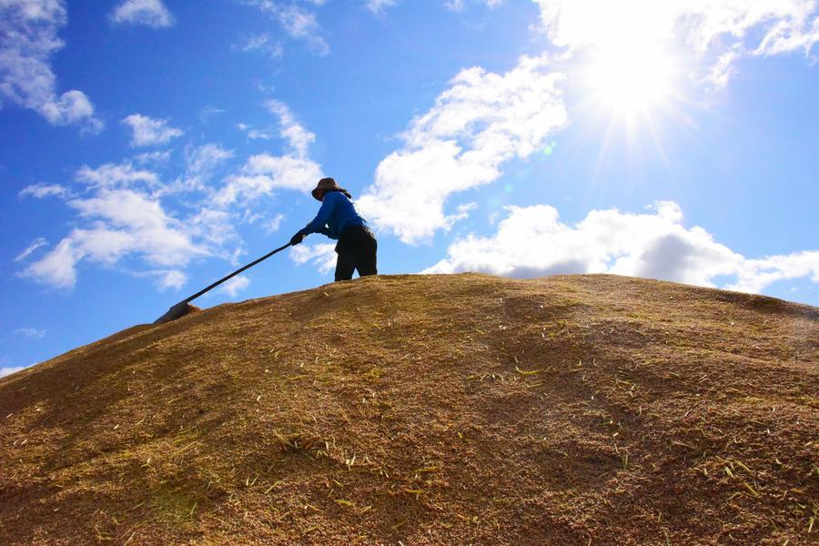 黒竜江省綏浜(すいひん)県の穀物乾燥場で、収穫した稲を集める作業員。(10月8日撮影、綏浜=新華社配信/李興)