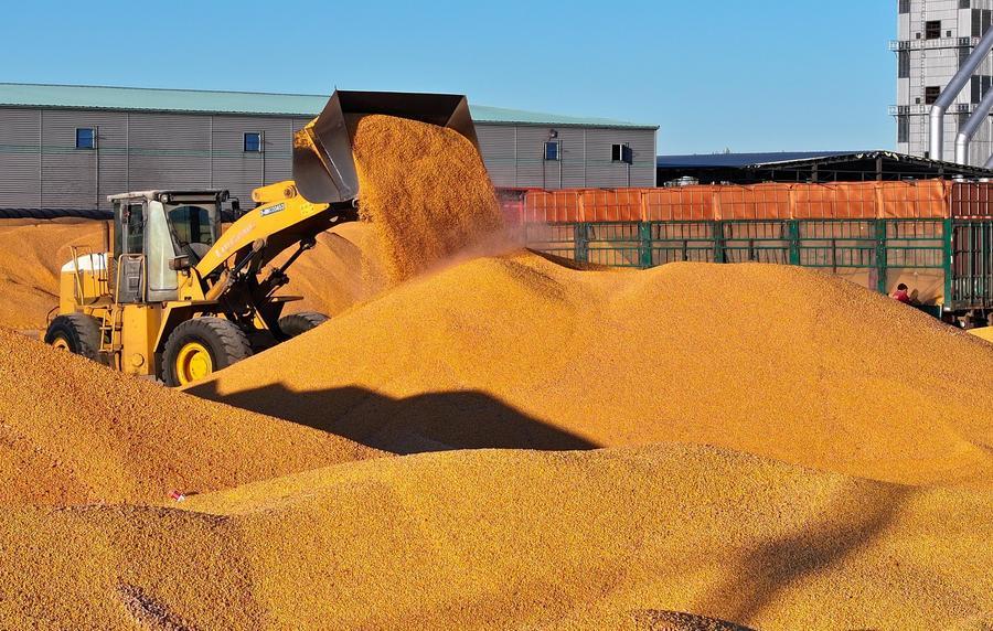 黒竜江省北安市の穀物乾燥場で、トウモロコシを運搬する作業車。(10月14日、ドローンから、北安=新華社配信/銭泊羽)