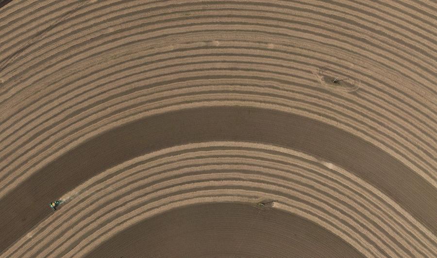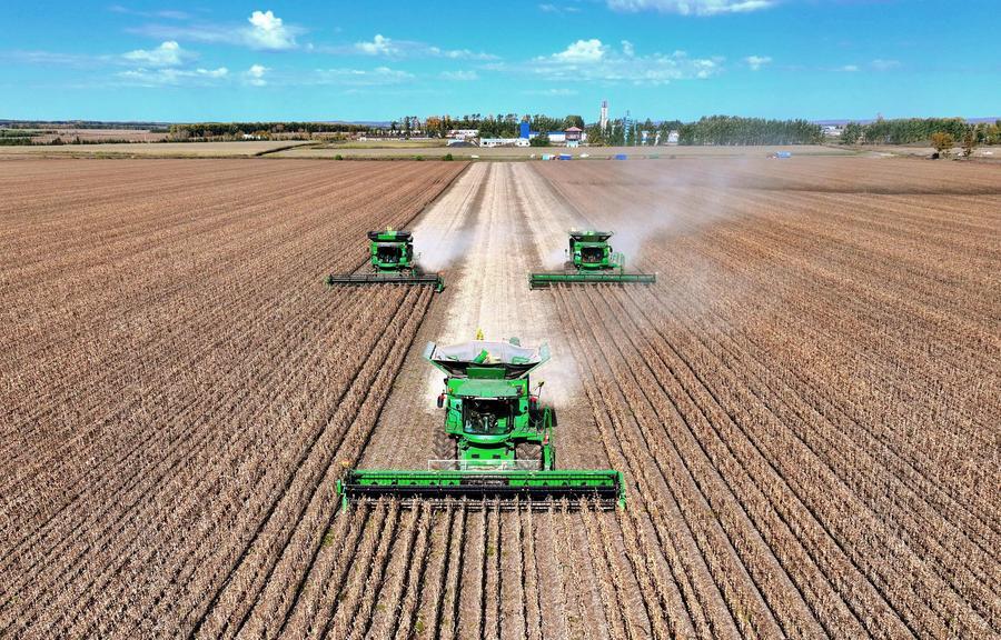 黒竜江省嫩江(どんこう)市の大豆農地で収穫作業を行う大型コンバイン。(9月29日、ドローンから、嫩江=新華社配信/林進春)
