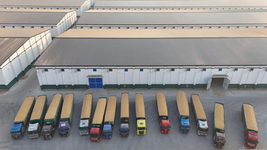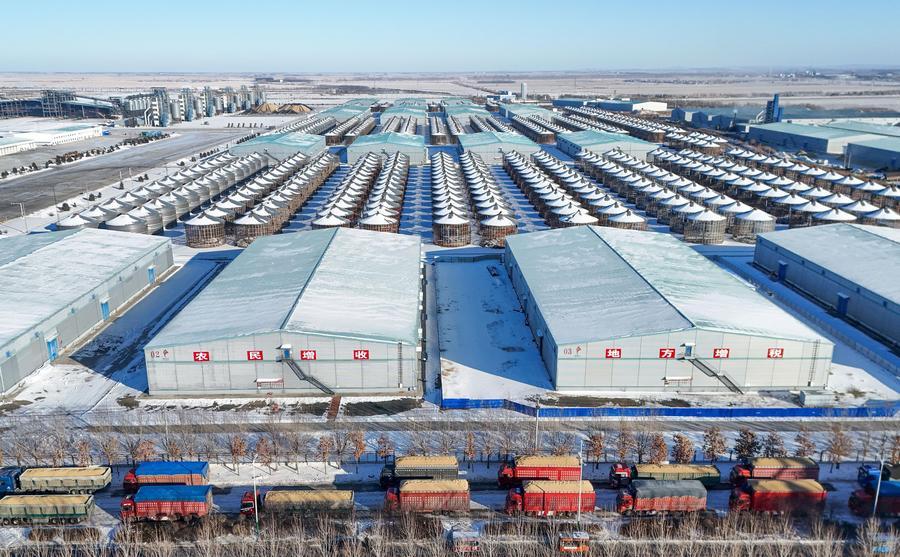 黒竜江省湯原鶴立国家食糧備蓄庫の前で、食糧を買い上げるために並ぶトラック。(11月12日撮影、ドローンから、湯原=新華社配信/顧景坤)