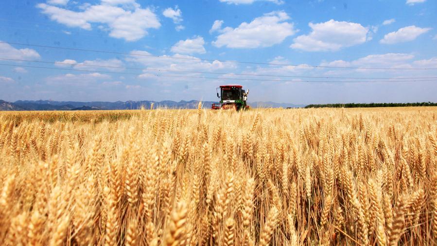 山東省臨沂市平邑(へいゆう)県で、小麦を収穫するコンバイン。(5月24日撮影、臨沂=新華社配信/武紀全)