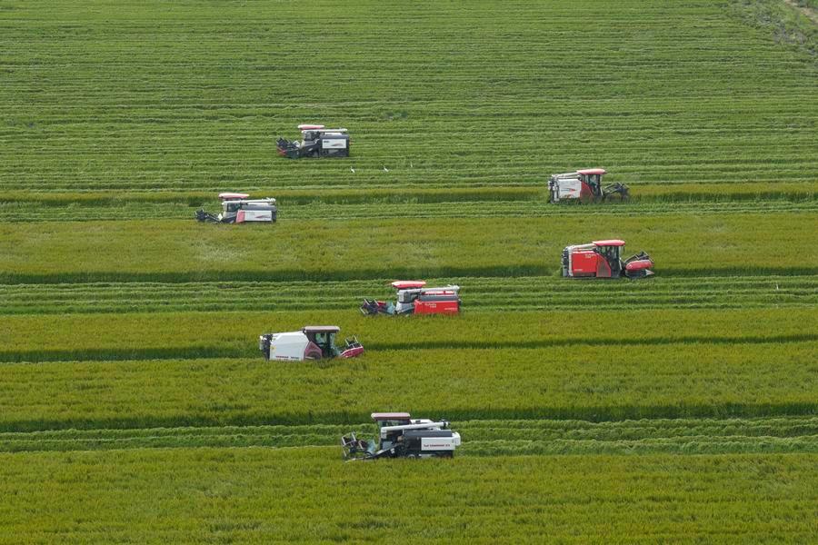 浙江省余姚市浜海現代農業産業先導区で晩稲を収穫するコンバイン。(9月23日、ドローンから、余姚=新華社配信/張輝)