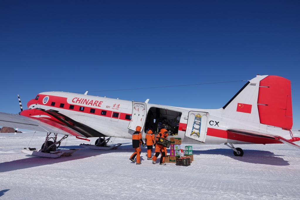 8日、南極のグローブ山地域に着陸した「雪鷹601」。内陸隊員のために生活物資と科学研究に使用する設備を輸送した。(雪竜号=新華社記者/顧天成)