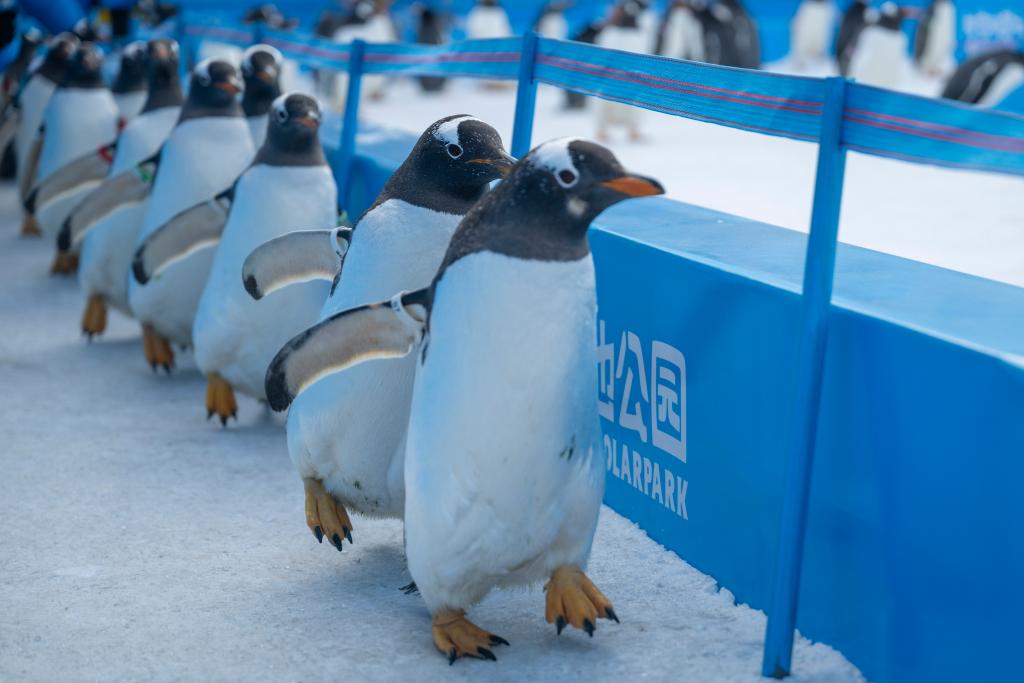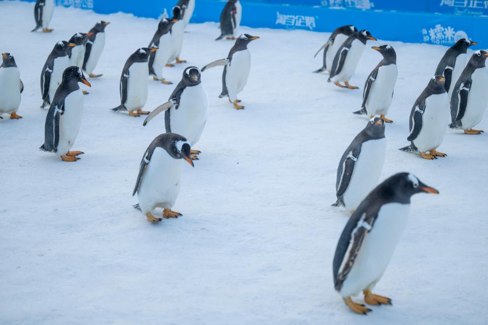 【新華社ハルビン12月14日】中国黒竜江省ハルビン市のテーマパーク、ハルビン極地公園で13日、ジェンツーペンギン100羽がパレードを披露した。