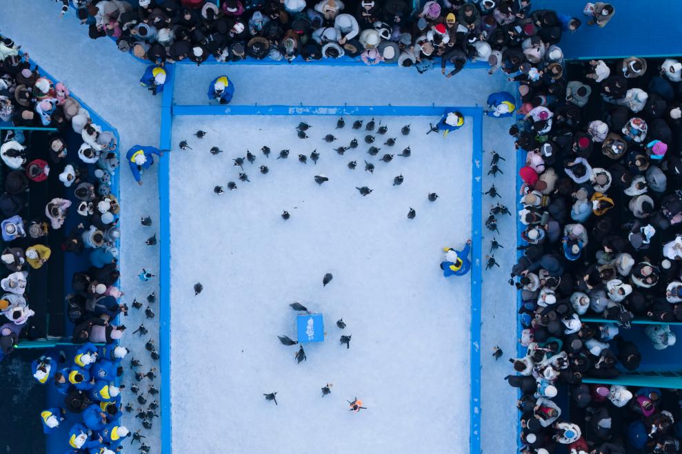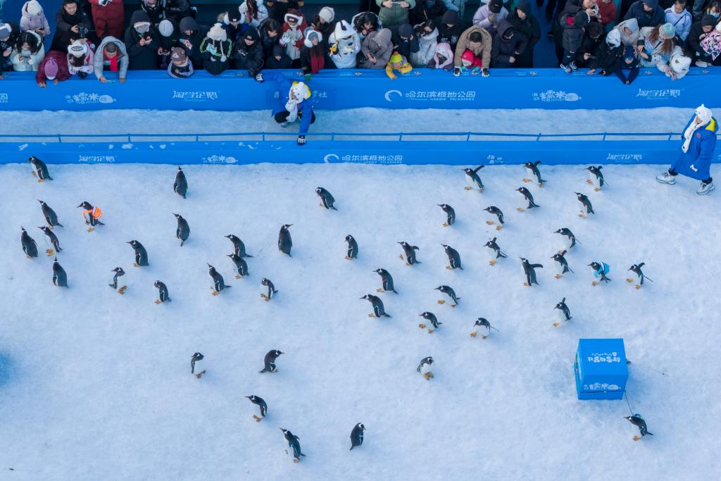 13日、ハルビン極地公園で屋外パレードを披露するペンギン。(ドローンから、ハルビン=新華社記者/張濤)