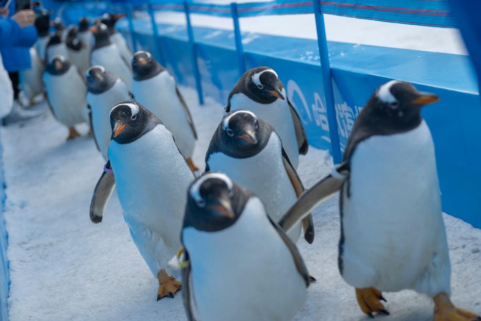 ペンギン100羽がパレード披露 中国・ハルビン市