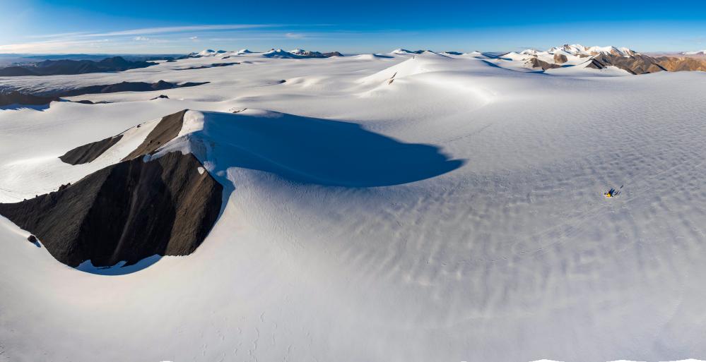 チャンタン国家級自然保護区の中核エリアに位置する普若崗日氷原。(2024年9月30日、ドローンから、ラサ=新華社記者/姜帆)