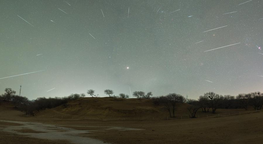 13日、黒竜江省ジャムス市樺川県に出現したふたご座流星群の流れ星。(ハルビン=新華社配信/朱宗強)
