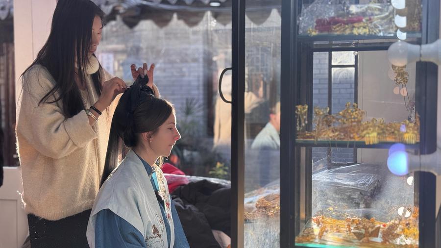 古鎮内の旅行撮影店では、米国ニューヨークから来たバレリーさんが店主の選んだ漢服に着替え、撮影体験に臨んでいた。バレリーさんはカメラマンの指導を受けながら、庭園の回廊で明代の女性の立ち居振る舞いを練習し、ポーズを決めた。