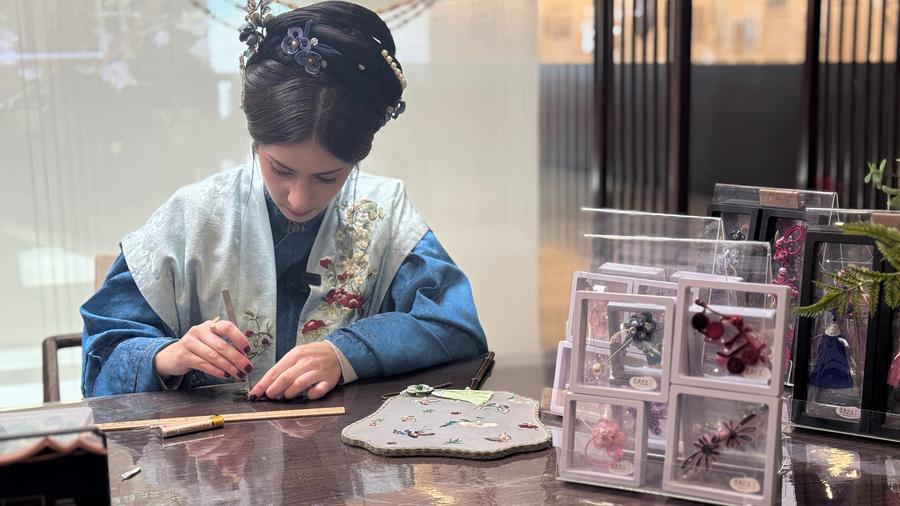 3日、西塘古鎮で漢服を着て無形文化遺産、盤扣(パンコウ、チャイナボタン)作りを体験する米国人観光客のバレリーさん。(杭州=新華社配信)