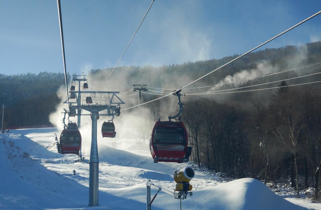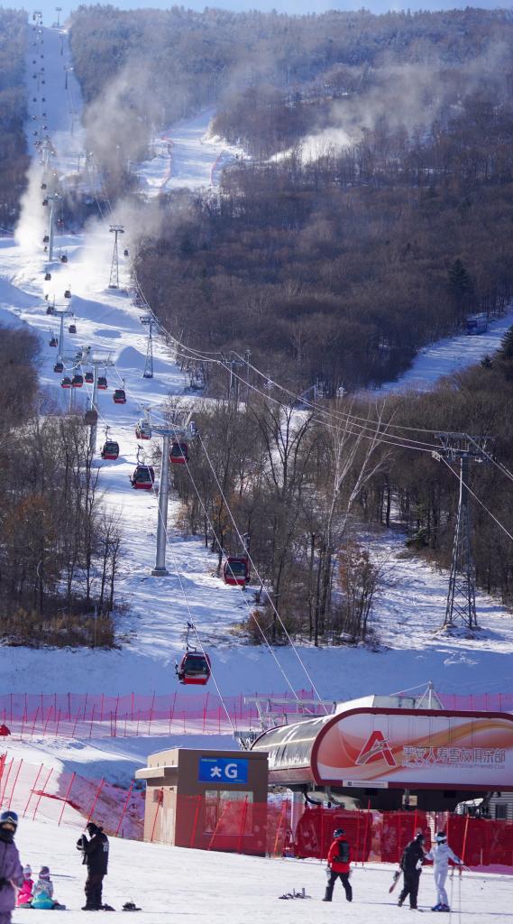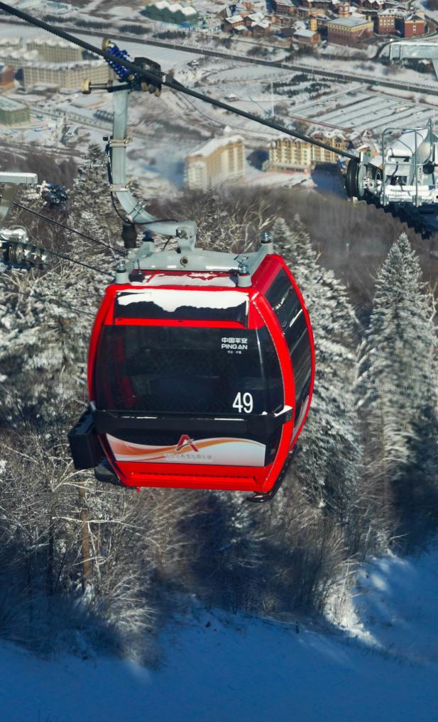 2日、北大湖スキーリゾート(吉林省吉林市)で運行するロープウエー。北京起重運輸機械設計研究院と徐州天馬索道䌫車設備(江蘇省徐州市)が共同開発した。(吉林=新華社記者/顔麟蘊)