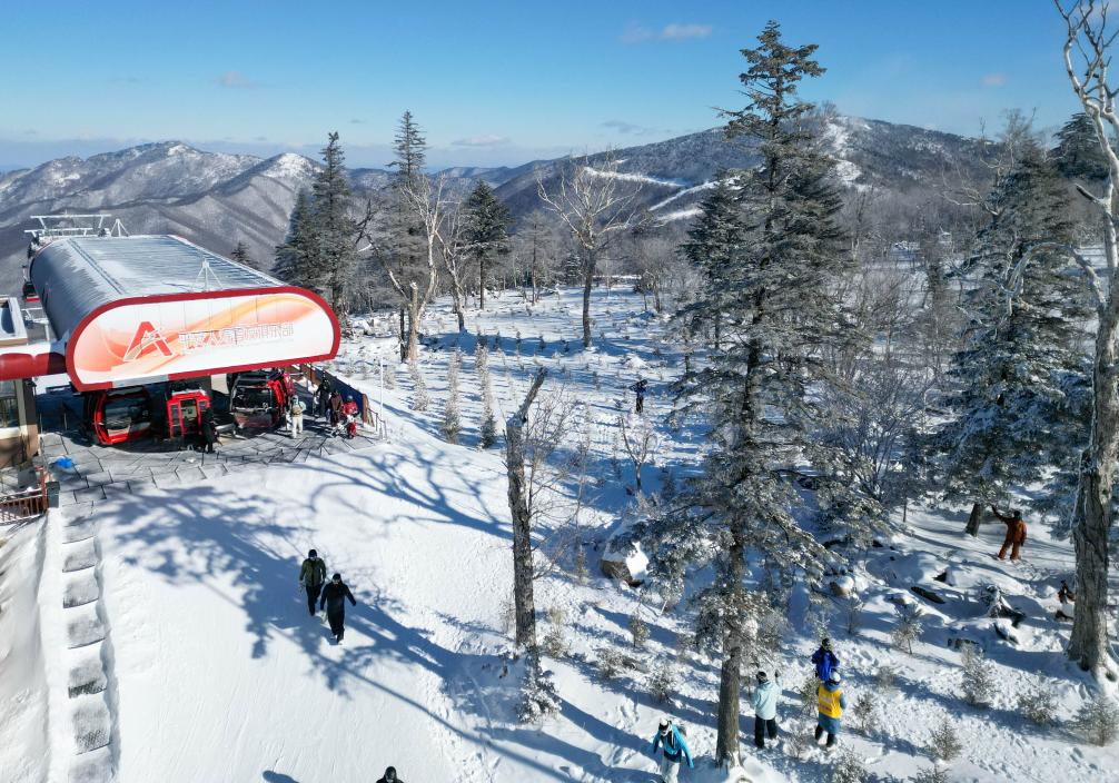 2日、北大湖スキーリゾート(吉林省吉林市)で、国産ロープウエーに乗り、山頂に到着したスキー客。(ドローンから、吉林=新華社記者/顔麟蘊)