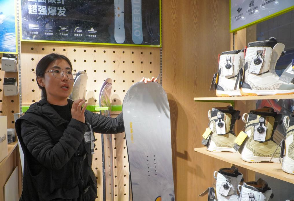 北大湖スキーリゾート(吉林省吉林市)のスキー用品店で、中国企業が独自開発したスノーボードを紹介する従業員。(2024年11月15日撮影、吉林=新華社記者/顔麟蘊)