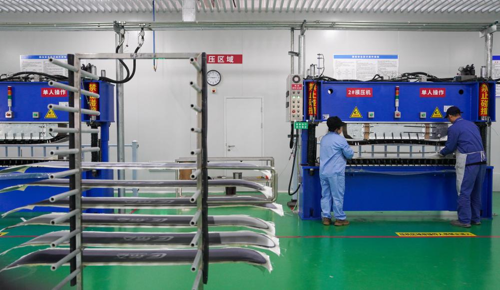 4日、吉林省吉林市の繊維メーカー、吉林国興複合材料の工場で、プレス成形機で炭素繊維製スノーボードを製造する従業員。(吉林=新華社記者/顔麟蘊)