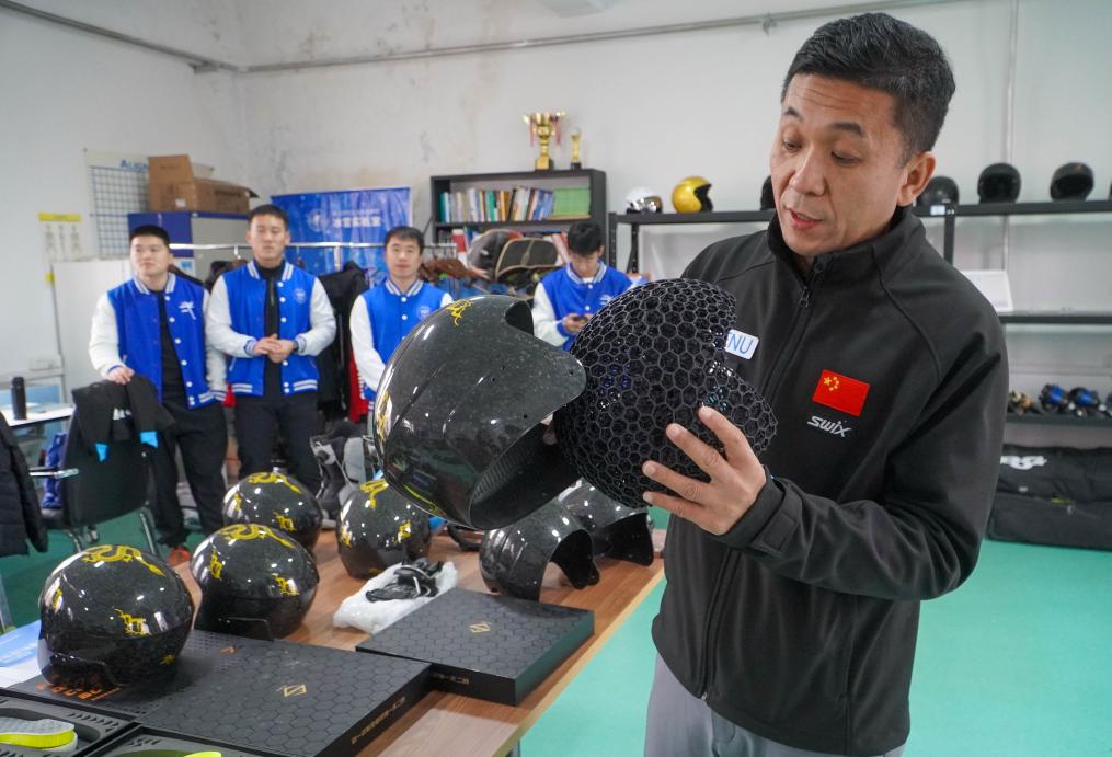 独自開発した3Dプリントのカスタムメイドヘルメットを紹介する吉林省ウィンタースポーツ重点実験室の劉俊一(りゅう・しゅんいつ)主任。(2024年11月14日撮影、吉林=新華社記者/顔麟蘊)