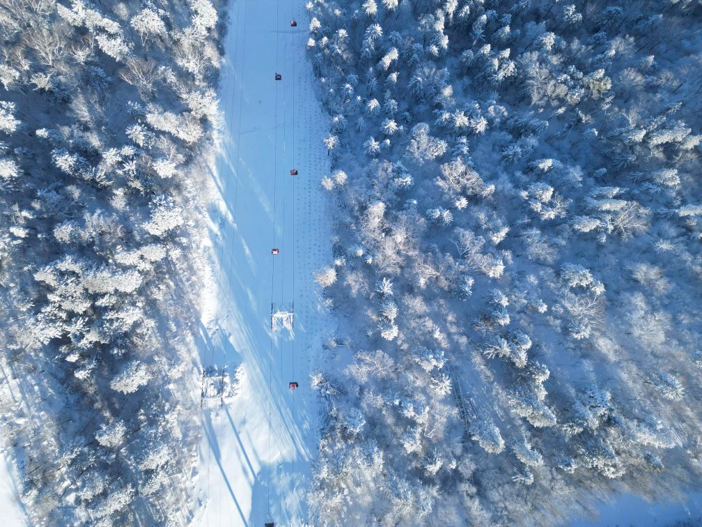 2日、北大湖スキーリゾート(吉林省吉林市)で運行するロープウエー。北京起重運輸機械設計研究院と徐州天馬索道䌫車設備(江蘇省徐州市)が共同開発した。(ドローンから、吉林=新華社記者/顔麟蘊)
