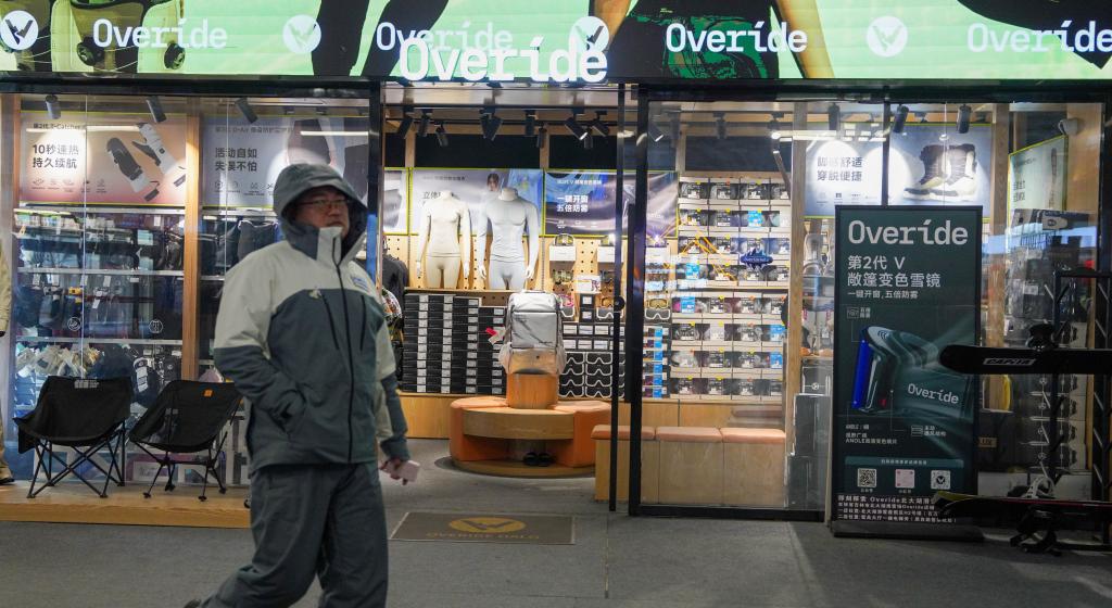 2日、北大湖スキーリゾート(吉林省吉林市)で、国産ブランドのスキー用品店の前を通り過ぎる人。(吉林=新華社記者/顔麟蘊)