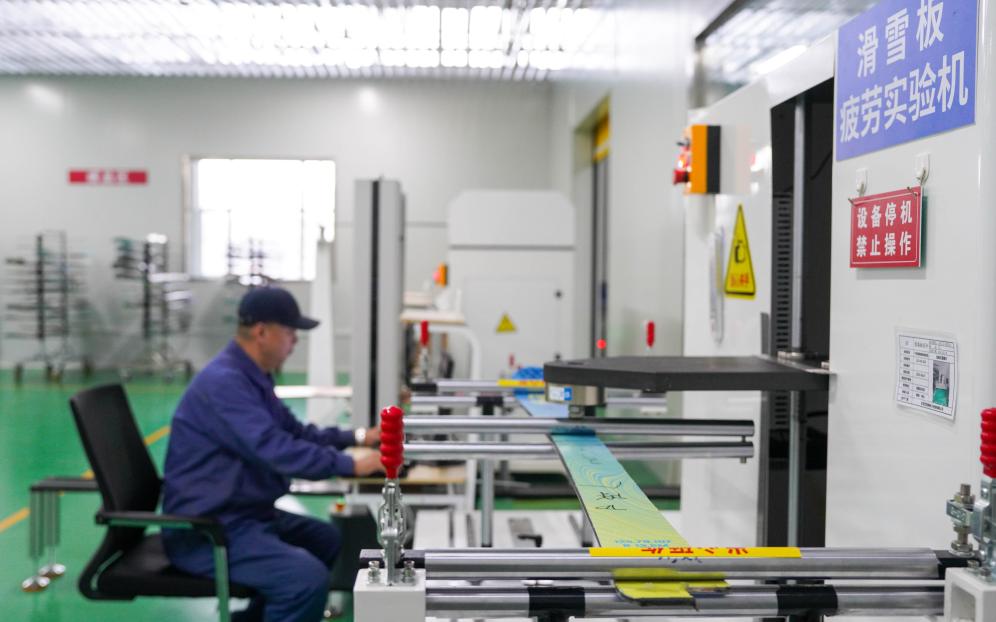 4日、吉林省吉林市の繊維メーカー、吉林国興複合材料の工場で、独自開発した炭素繊維製スノーボードを再検査する従業員。(吉林=新華社記者/顔麟蘊)