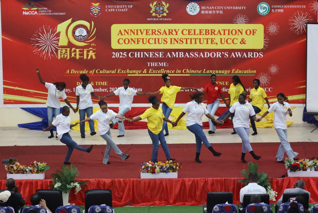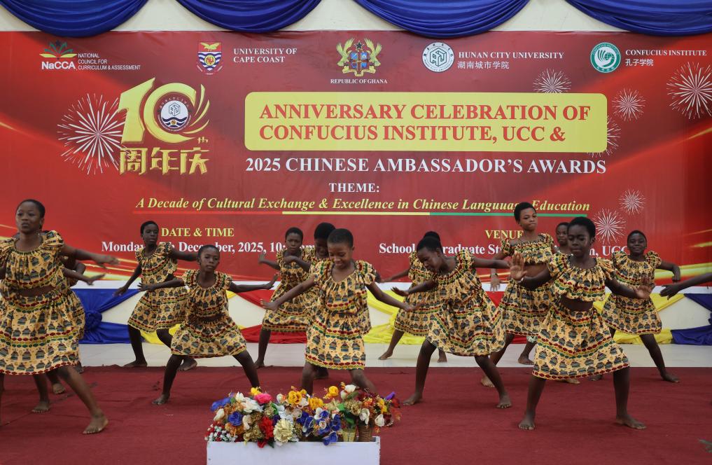 15日、ケープコースト大学孔子学院設立10周年記念式典でパフォーマンスを披露する学生。(ケープコースト=新華社配信)