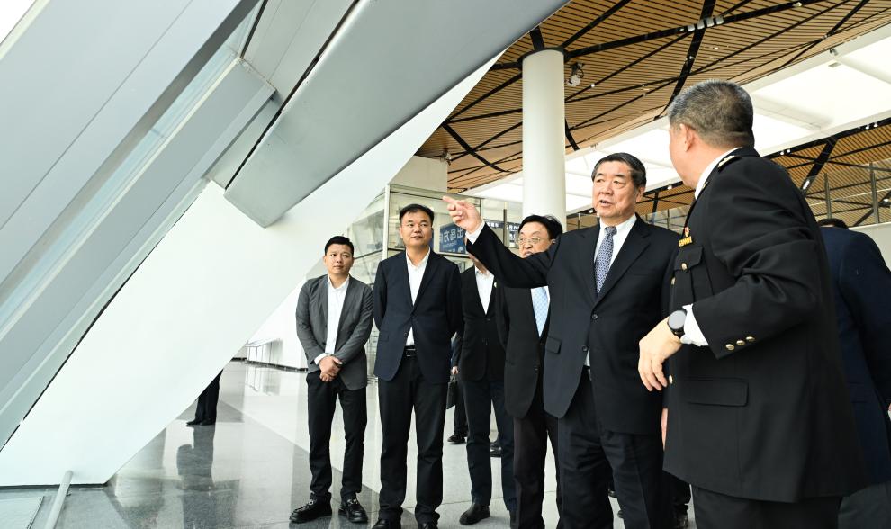 18日、海口市の新海港と南港に設けられた「二線口岸(海南島と中国内地を隔てる関税境界)」の密輸対策部門を視察する何立峰氏。(海口=新華社記者/楊冠宇)