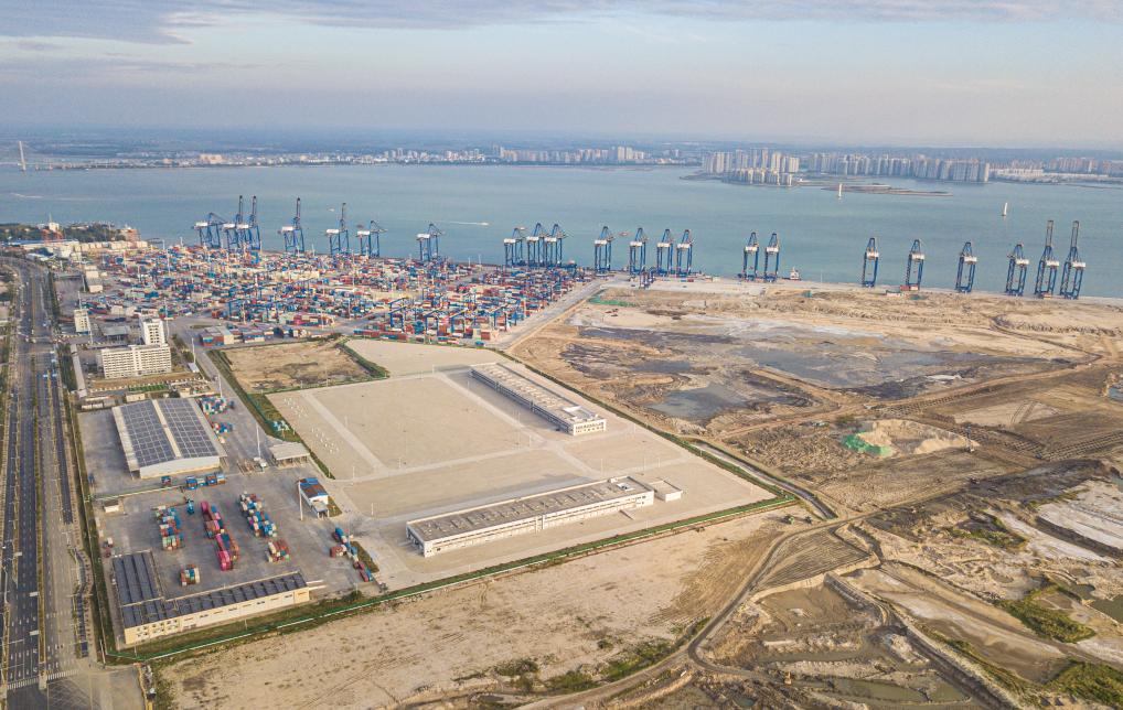 海南省洋浦経済開発区の洋浦港通関地。(11月21日、ドローンから、海口=新華社記者/蒲暁旭)