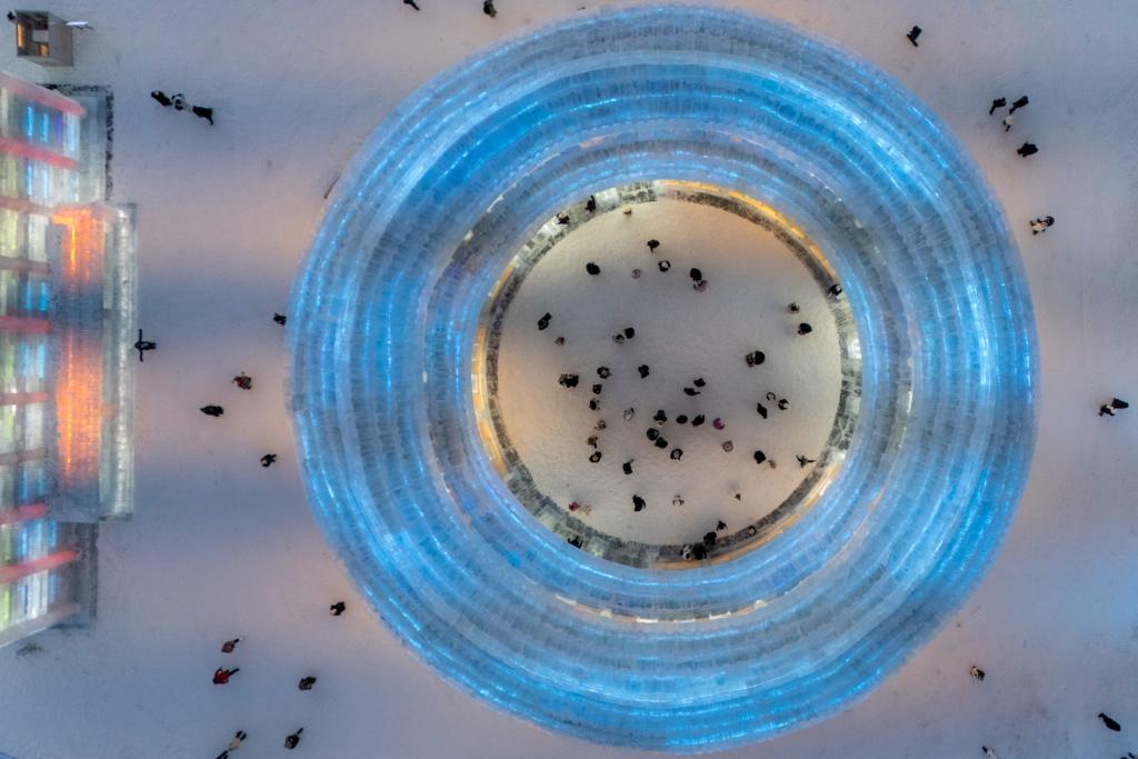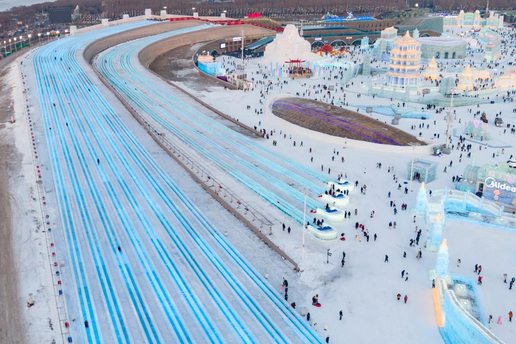 17日、「ハルビン氷雪大世界」で、氷の滑り台を体験する観光客。(ドローンから、ハルビン=新華社記者/謝剣飛)