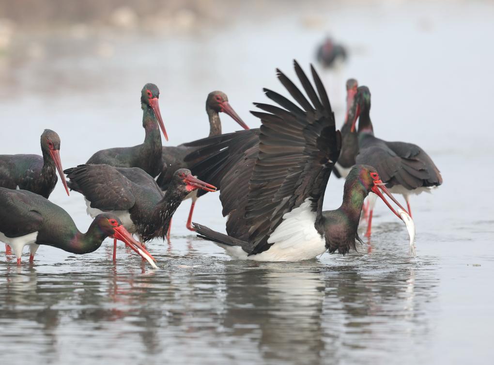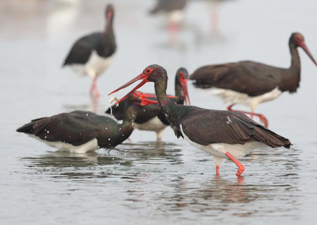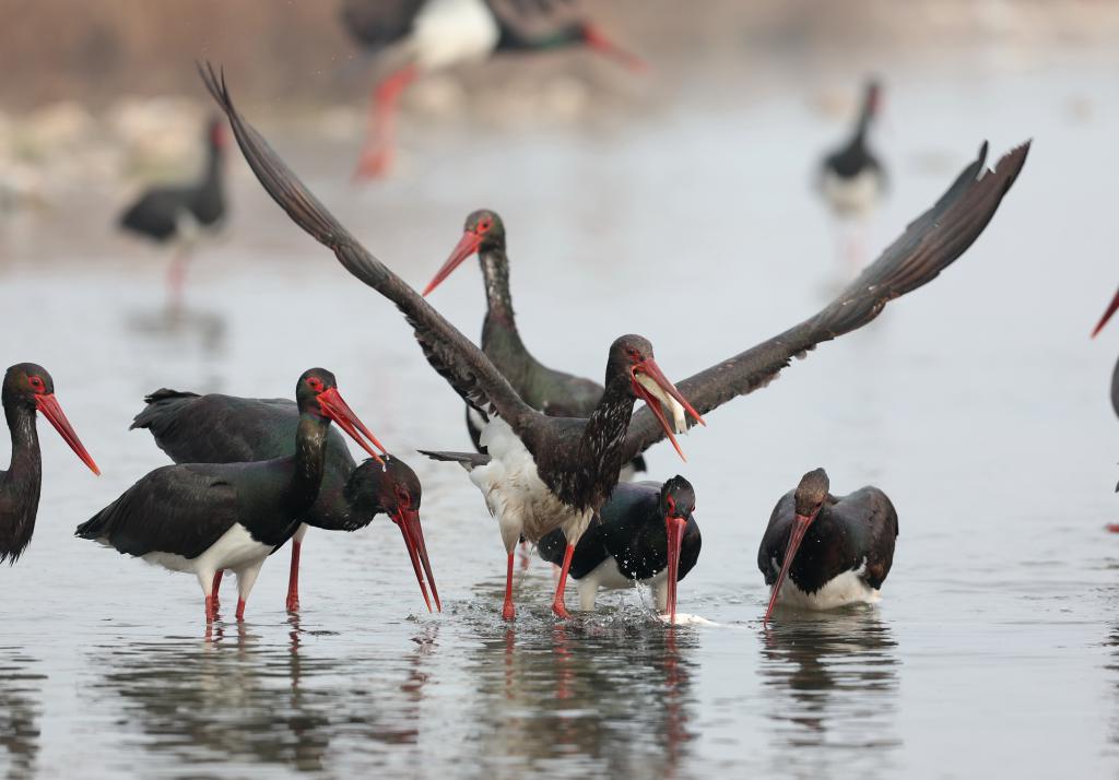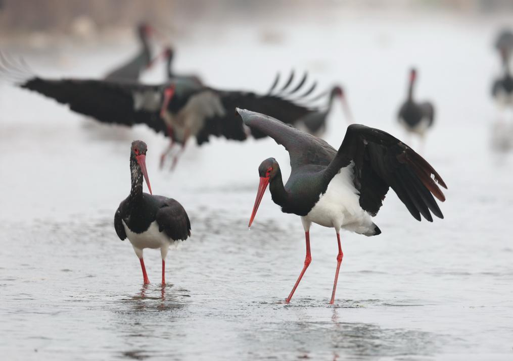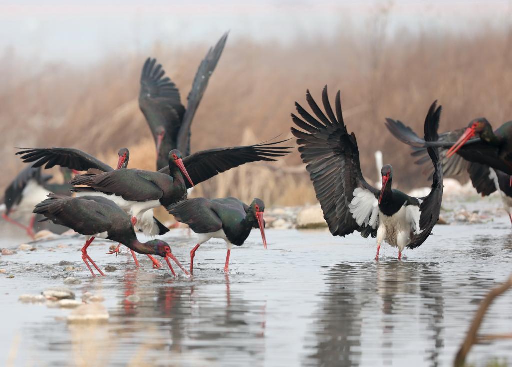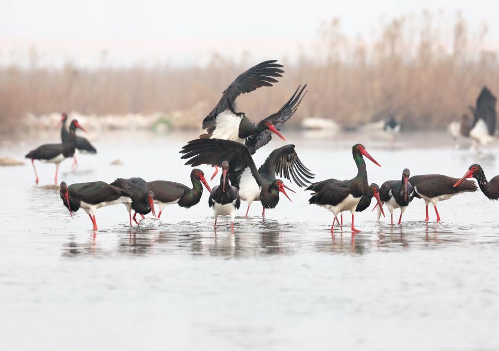 19日、綿蔓河で餌を探すナベコウの群れ。(石家荘=新華社記者/楊世尭)