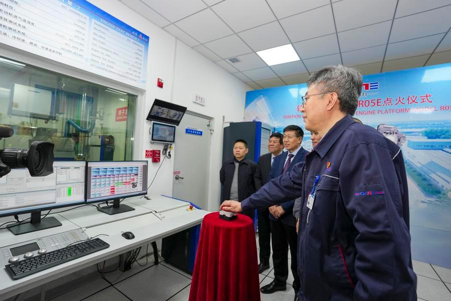 19日、「R05E」試作機の点火スイッチを押すハルビン東安汽車動力の趙興天(ちょう・こうてん)副総経理(右)。(ハルビン=新華社記者/王松)