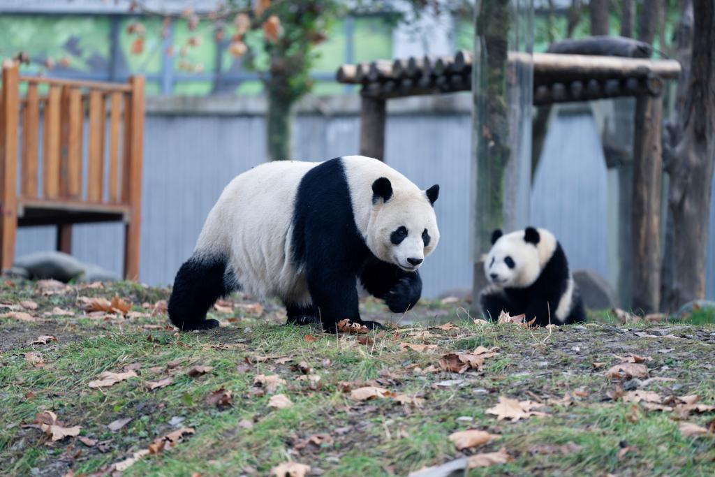10日、のんびり散歩する珍珍(左)。(成都=新華社配信/Panda365提供)