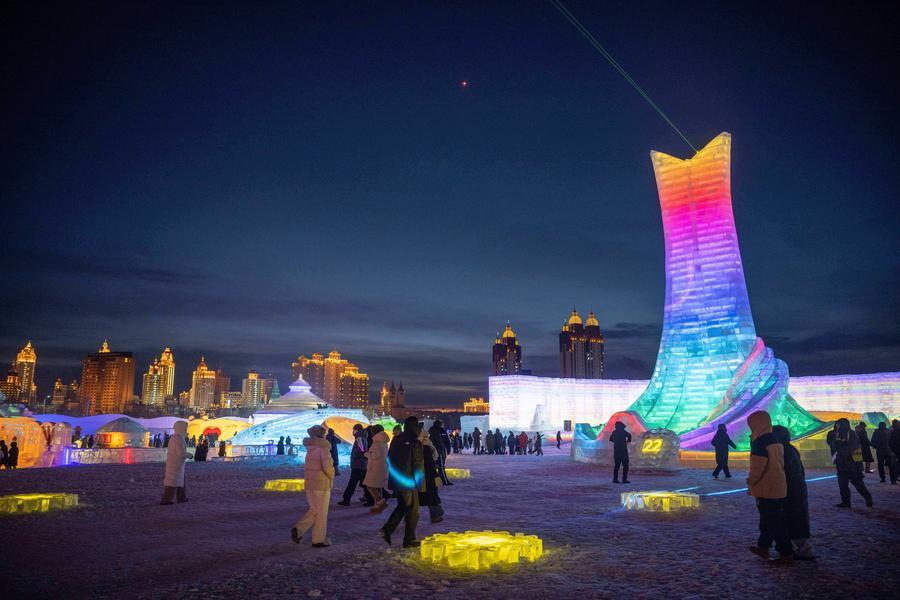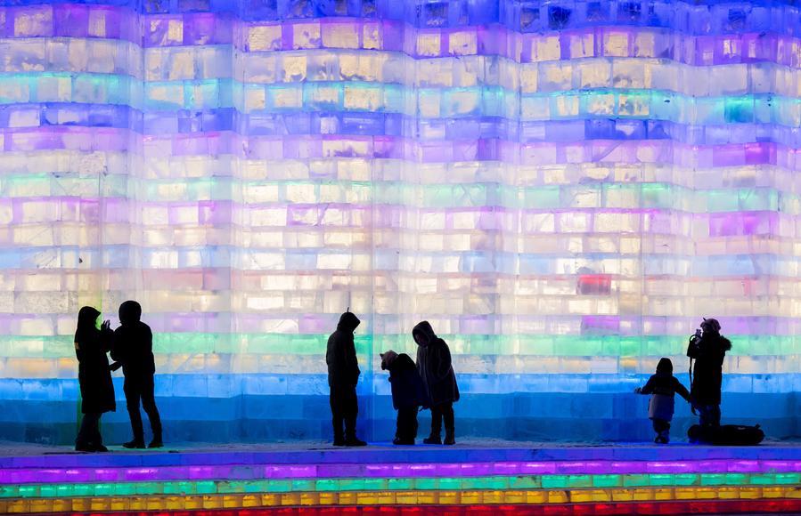 20日、氷雪祭りの会場を散策する市民や観光客。(満洲里=新華社記者/連振)