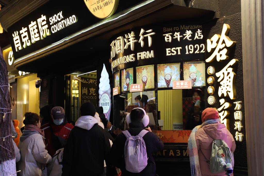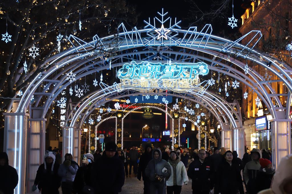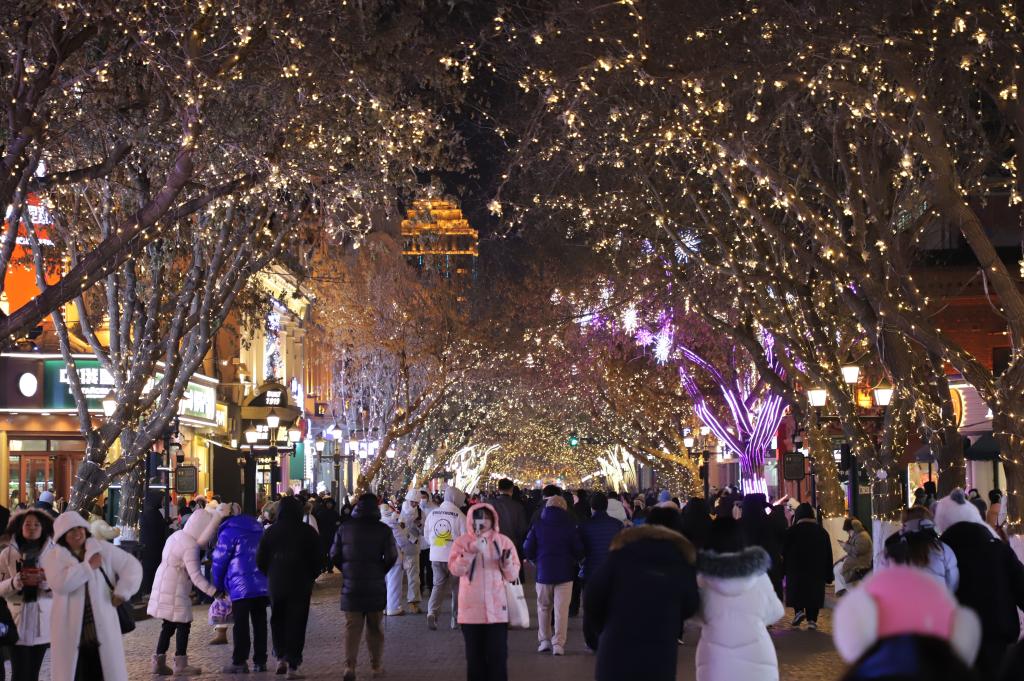 【新華社ハルビン12月21日】中国黒竜江省ハルビン市を代表する観光エリア、中央大街は冬の観光シーズンを迎え、連日多くの人でにぎわっている。日が暮れるとイルミネーションの光が加わり、100年前の趣を色濃く残す町並みの中で、人々が幻想的な夜景を写真に収めている。