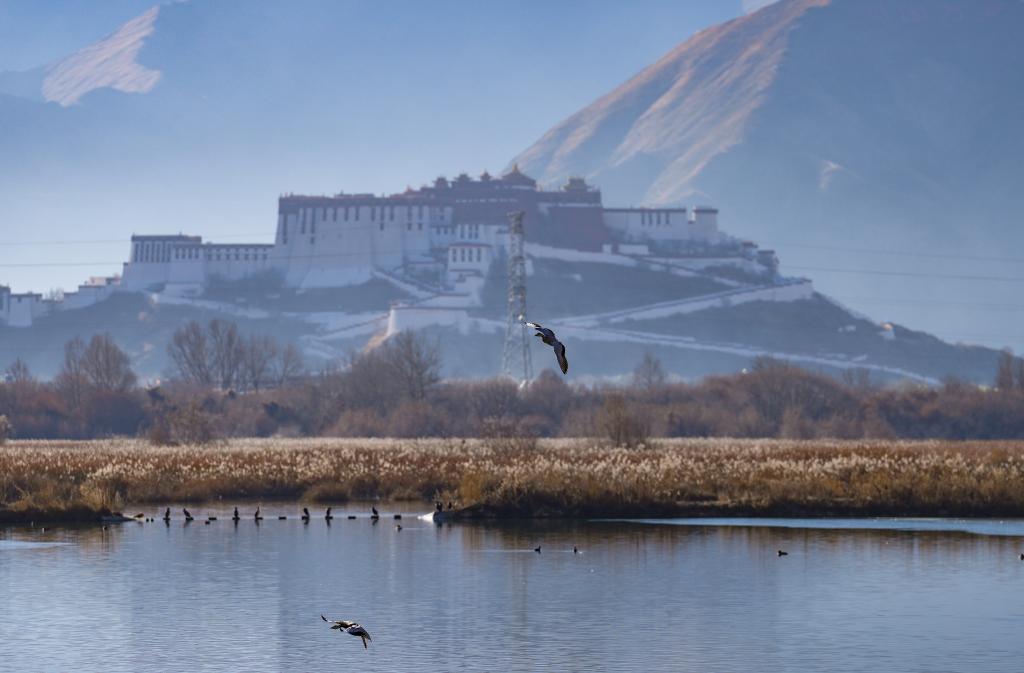20日、拉魯湿地の上を飛ぶインドガン。(ラサ=新華社記者/晋美多吉)