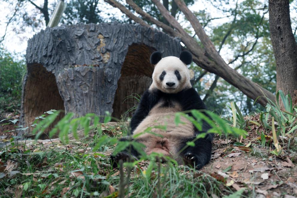 座り込むシャンシャン。(12月2日撮影、成都=新華社配信/Panda365提供)