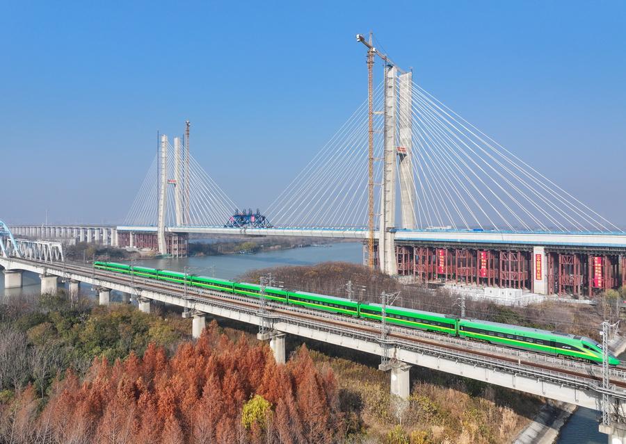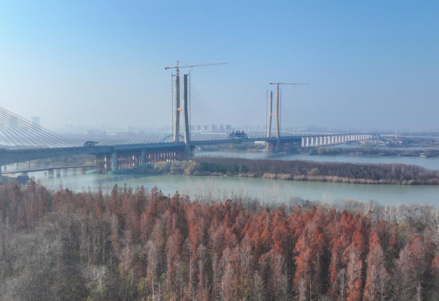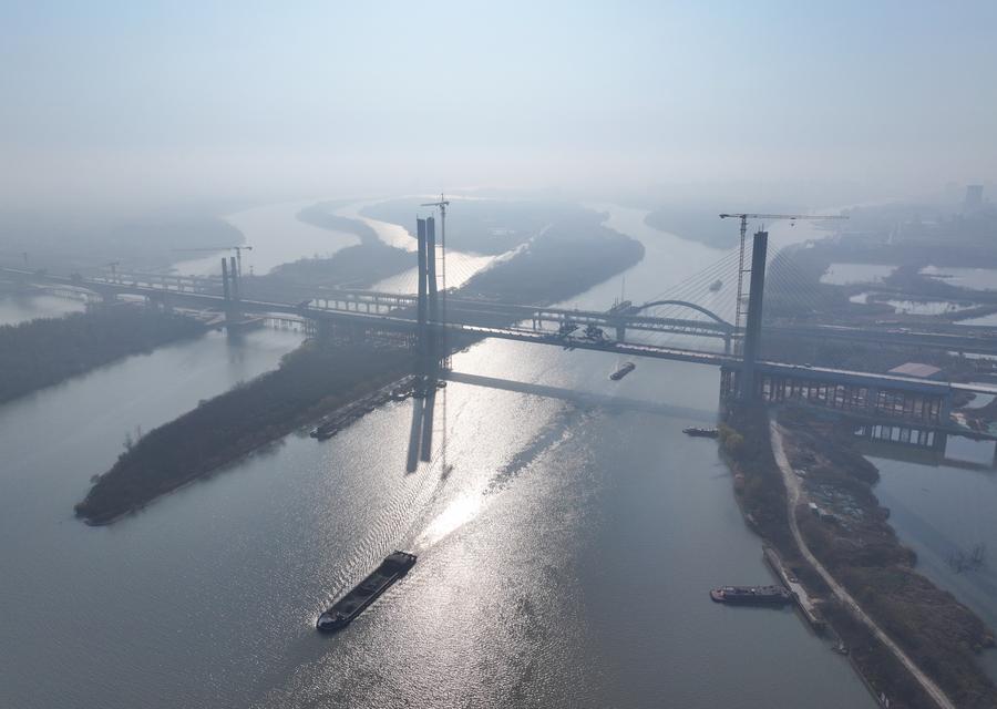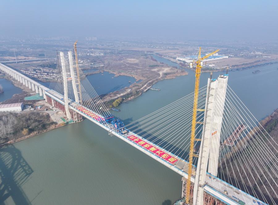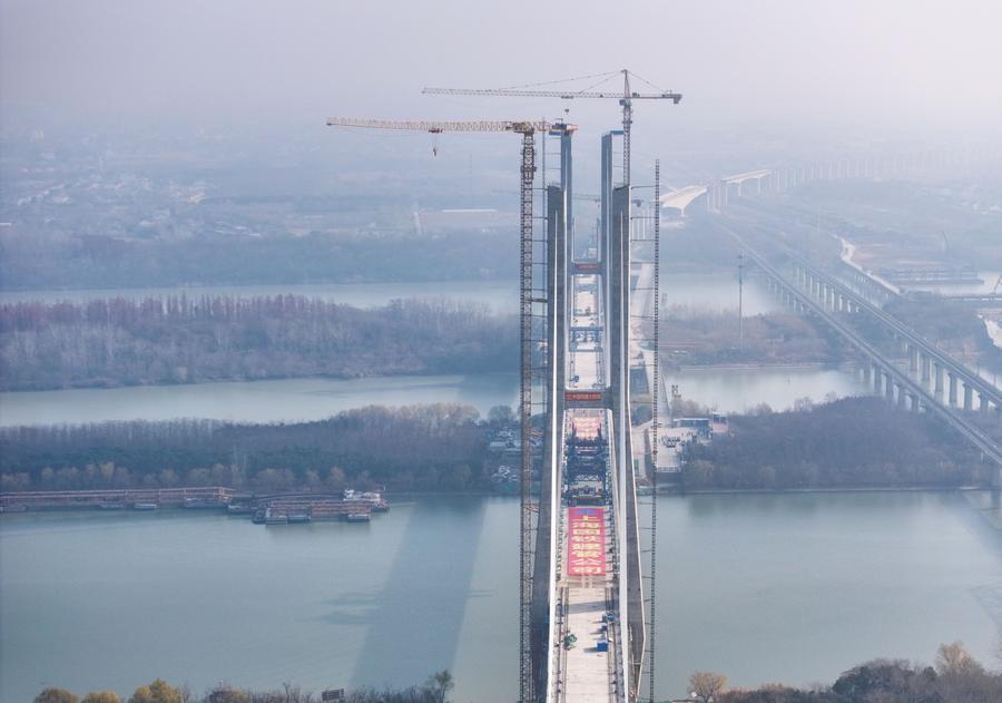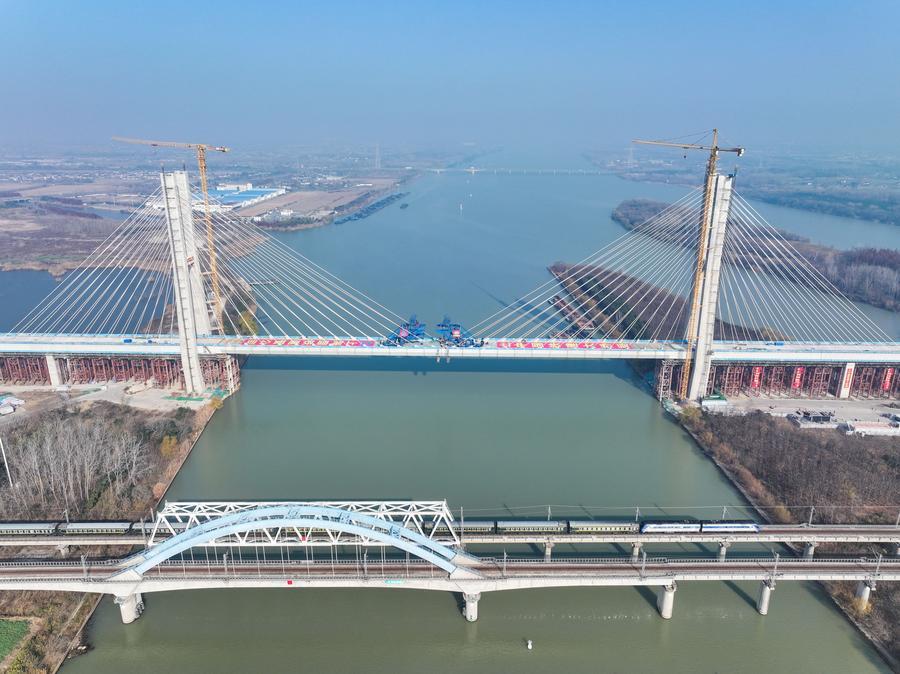 【新華社揚洲12月22日】中国インフラ建設大手の中国鉄建大橋工程局集団が建設を担う滬渝蓉(こゆよう)高速鉄道(上海-重慶-四川省成都)の通泰揚特大橋は19日、京杭大運河をまたぐ斜張橋部分が接合され、工事が大きく進展した。斜張橋は江蘇省揚州市に位置し、全長564・3メートル、主径間300メートル、主塔の高さ128メートル。航路水位から橋面まで約30メートルある。