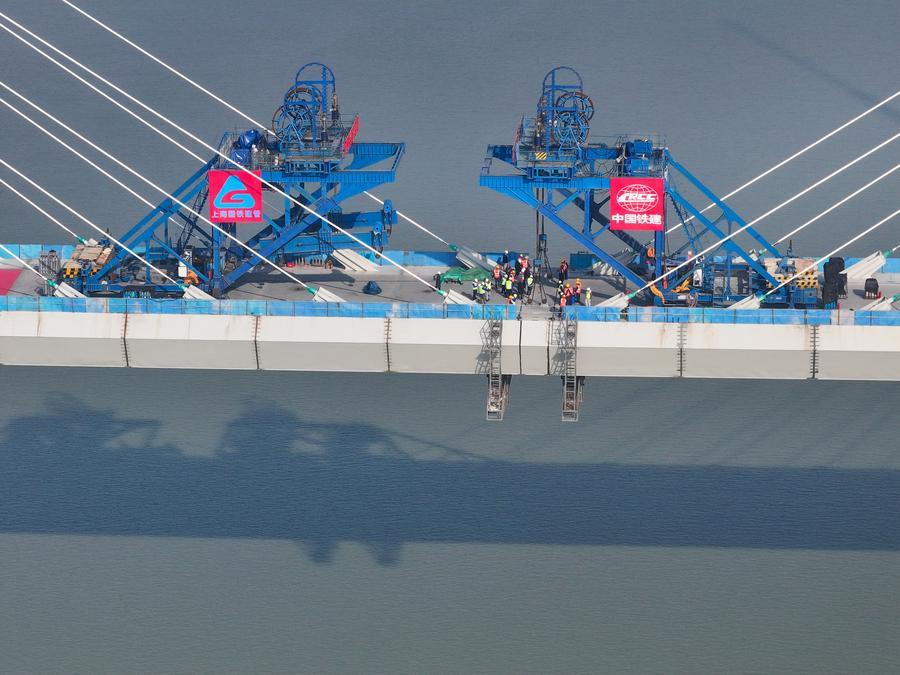 19日、接合工事が進む通泰揚特大橋の斜張橋部分。(ドローンから、揚州=新華社記者/季春鵬)