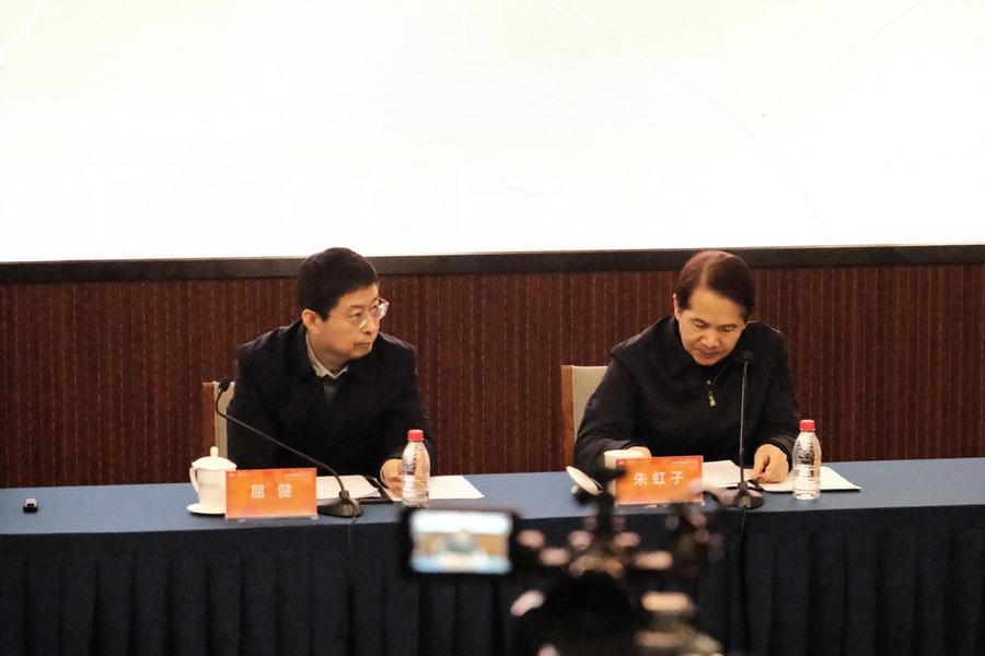 22日、第10回中国北京国際美術ビエンナーレの記者会見に出席した屈健(くつ・けん)中国美術家協会分党組書記・駐会(常勤)副主席(左)と朱虹子(しゅ・こうし)中国美術家協会分党組メンバー・副秘書長。(北京=新華社記者/李卓璠)