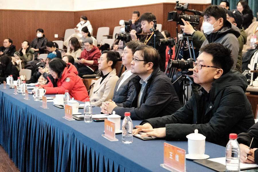 22日、第10回中国北京国際美術ビエンナーレの記者会見に出席した来賓と報道関係者。(北京=新華社記者/李卓璠)