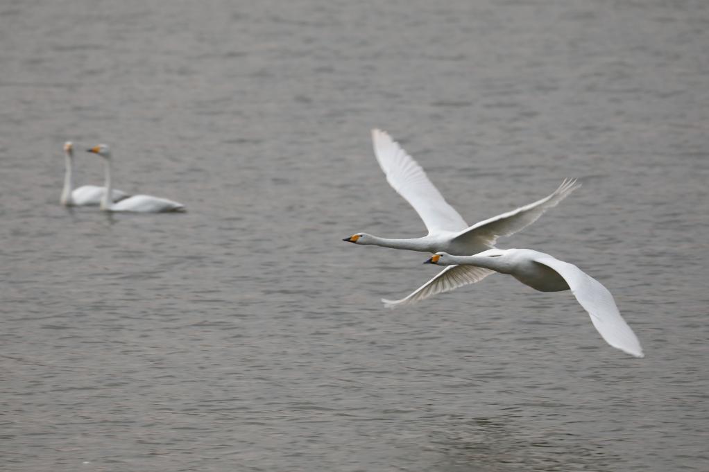 21日、河南省三門峡市の天鵝湖国家都市湿地公園を飛ぶハクチョウ。(三門峡=新華社配信/徐宏星)