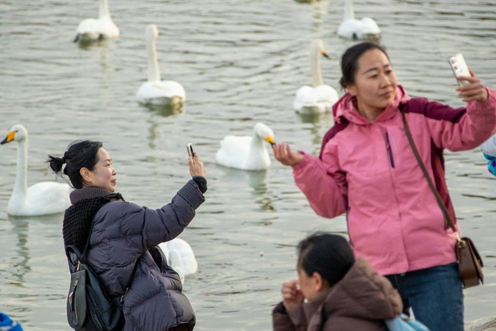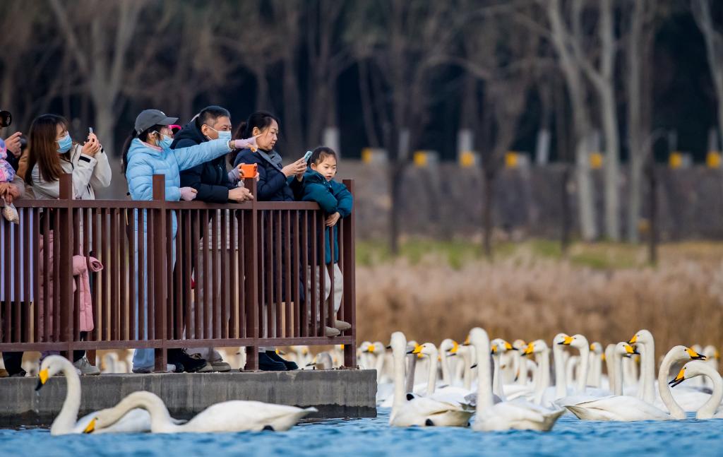 20日、河南省三門峡市の天鵝湖国家都市湿地公園でハクチョウを見る観光客。(三門峡=新華社配信/趙永濤)