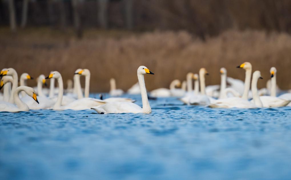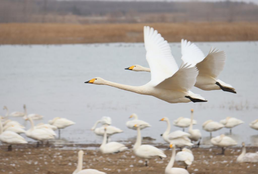 21日、河南省三門峡市の黄河湿地で撮影したハクチョウ。(三門峡=新華社配信/段二平)