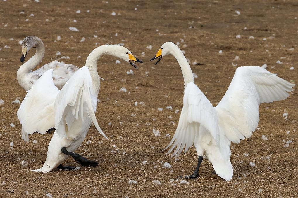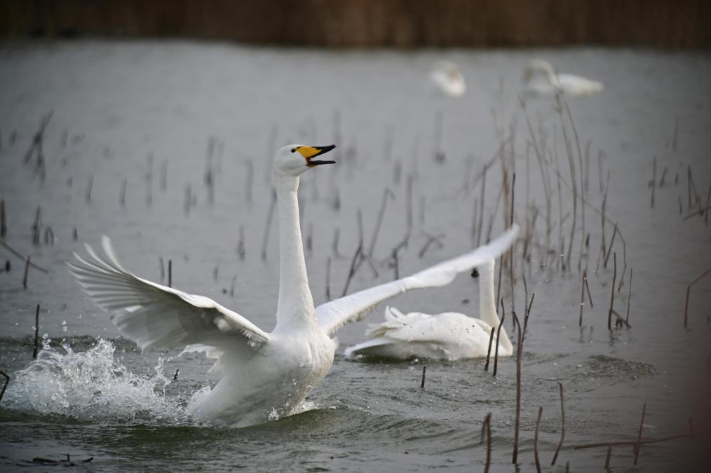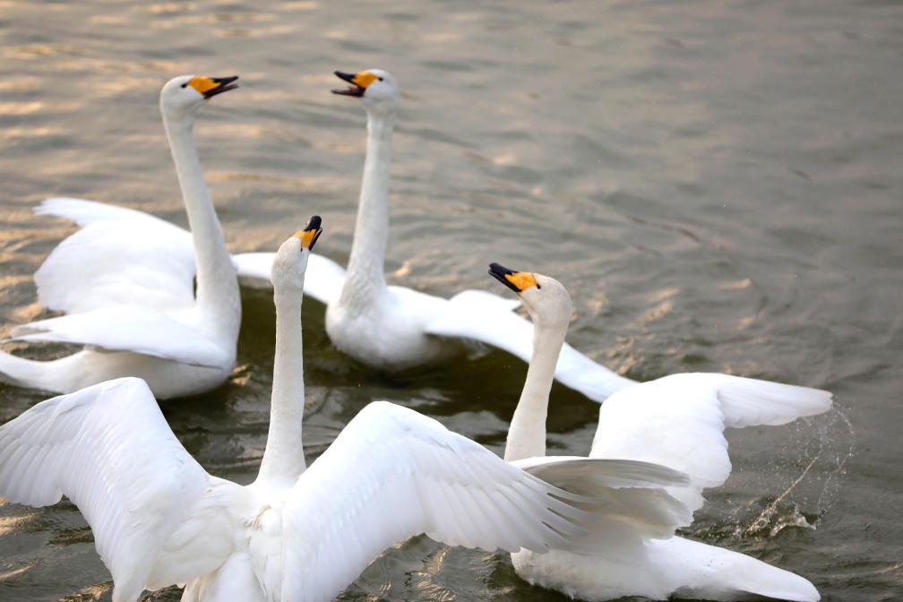 21日、河南省三門峡市の黄河湿地で鳴き交わすハクチョウ。(三門峡=新華社配信/段二平)