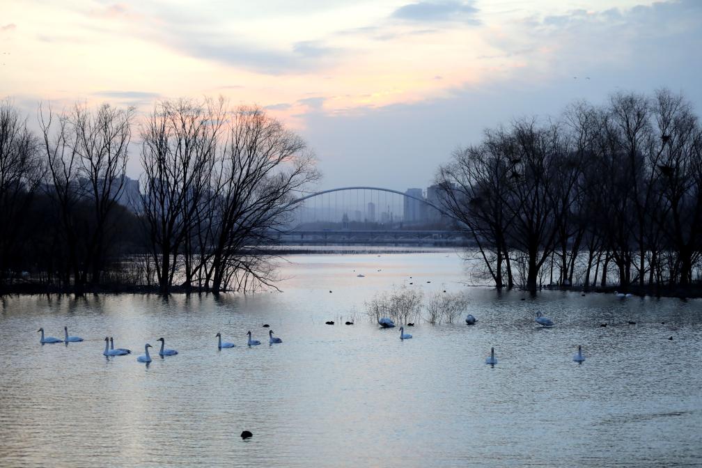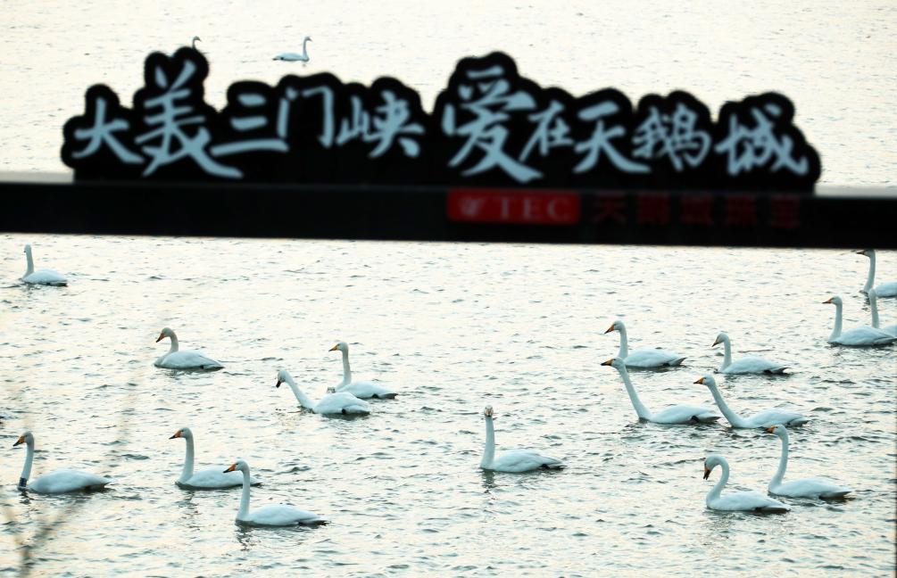 20日、河南省三門峡市の天鵝湖国家都市湿地公園で撮影したハクチョウ。(三門峡=新華社配信/馮小敏)