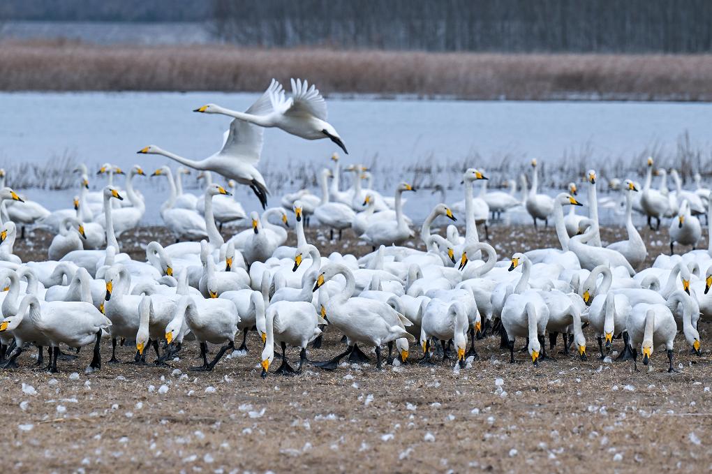 20日、河南省三門峡市の黄河湿地に集まるハクチョウ。(三門峡=新華社配信/李恒)