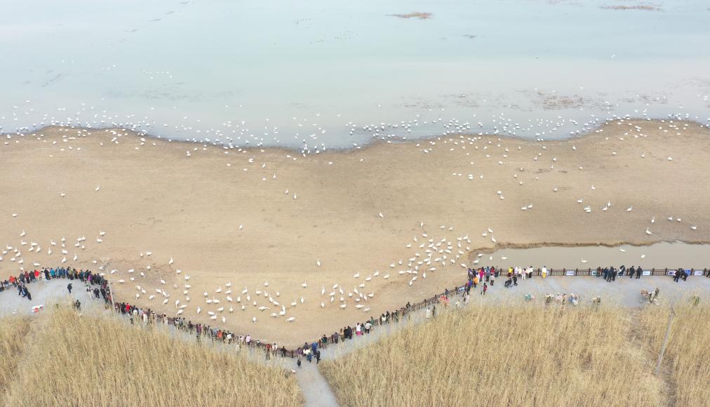 20日、河南省三門峡市の黄河湿地でハクチョウを見る観光客。(三門峡=新華社配信/徐沢源)